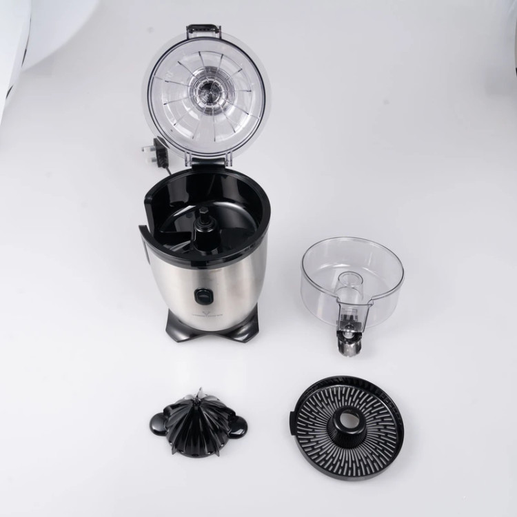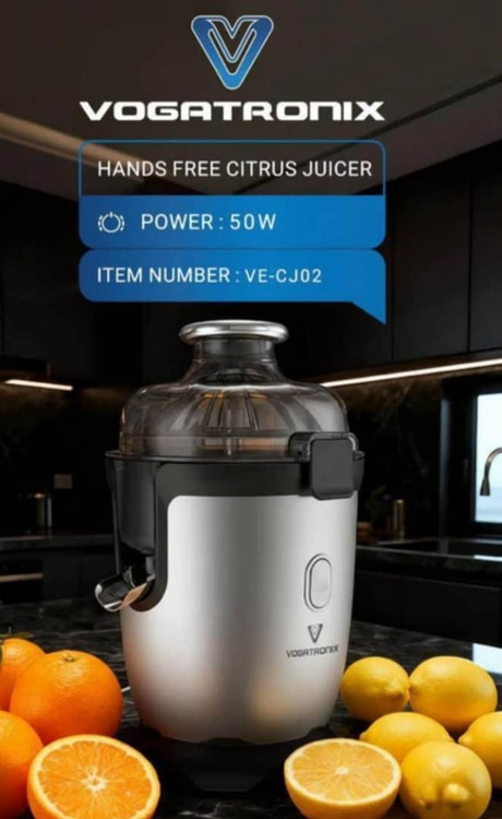 آب مرکباتگیر Vogatronix VE-CJ02 یک مدل اتوماتیک و بدون نیاز به استفاده از دست (Hands-Free) است که با طراحی مدرن و بدنهی مقاوم، امکان گرفتن آب انواع مرکبات مثل پرتقال، لیمو، لیموترش، گریپفروت و نارنگی را به سادهترین شکل فراهم میکند. این دستگاه از یک موتور 50 واتی با سیمپیچ مسی و جریان DC بهره میبرد که علاوه بر قدرت مناسب، عمر طولانی و عملکرد کمصدا را تضمین میکند. در قسمت بالایی دستگاه یک درپوش فشاری وجود دارد تا فقط با قرار دادن نصف میوه و پایین آوردن آن، عملیات آبگیری بهطور کامل و یکنواخت انجام شود؛ بدون اینکه نیاز باشد میوه را با دست فشار دهید یا نگه دارید. بدنهی دستگاه ترکیبی از پلاستیک مقاوم ABS و بخشهای فلزی است که هم زیبایی ظاهری دارد، هم دوام بالا. صافی داخلی دستگاه از جنس استیل ضدزنگ ساخته شده تا در تماس مداوم با آبمیوه، زنگ نزند و طعم نوشیدنی را تغییر ندهد. آبمیوه پس از استخراج، مستقیماً از طریق خروجی جلوی دستگاه وارد لیوان میشود و این خروجی دارای طراحی Drip-Free است تا چکه نکند. این مدل از نظر ابعاد کمی بزرگتر از یک مدل معمولی خانگی است و بهخاطر طراحی تخممرغیشکل روی پایههای کوتاه قرار میگیرد؛ سبک، قابل حمل و مناسب خانه، آشپزخانه، کافیشاپ کوچک و آبمیوهگیری روزمره. سیستم آن مصرف بسیار پایینی دارد و با ولتاژ 220–240 ولت / 50–60 هرتز کار میکند. همچنین مصرف انرژی آن در برچسب دستگاه رده A ثبت شده است. در مجموع VE-CJ02 دستگاهی است که با قدرت کافی، کارکرد خودکار، شستوشوی آسان و ظاهر شیک، تجربهی آبمیوهگیری را سریع، تمیز و بدون دردسر میکند